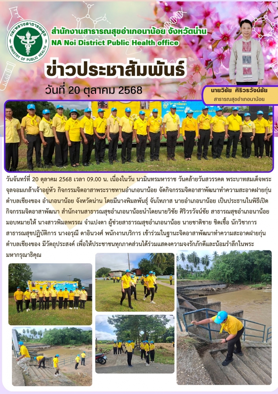 วันจันทร์ที่ 20 ตุลาคม 2568 เวลา 09.00 น. เนื่องในวัน นวมินทรมหาราช วันคล้ายวันสวรรคต พระบาทสมเด็จพระจุลจอมเกล้าเจ้าอยู่หัว กิจกรรมจิตอาสาพระราชทานอำเภอนาน้อย จัดกิจกรรมจิตอาสาพัฒนาทำความสะอาดฝายกุ่น ตำบลเชียงของ อำเภอนาน้อย จังหวัดน่าน โดยมีนางพิมลพันธุ์ จันโทภาส นายอำเภอนาน้อย เป็นประธานในพิธีเปิดกิจกรรมจิตอาสาพัฒนา สำนักงานสาธารณสุขอำเภอนาน้อยนำโดยนายวิชัย ศิริวรวัจน์ชัย สาธารณสุขอำเภอนาน้อย มอบหมายให้ นางสาวพิมลพรรณ จำแปงตา ผู้ช่วยสาธารณสุขอำเภอนาน้อย นายชาติชาย ชิดเชื้อ นักวิชาการสาธารณสุขปฏิบัติการ นางอรุณี ดาอินวงศ์ พนักงานบริการ เข้าร่วมในฐานะจิตอาสาพัฒนาทำความสะอาดฝายกุ่น ตำบลเชียงของ มีวัตถุประสงค์ เพื่อให้ประชาชนทุกภาคส่วนได้ร่วมแสดงความจงรักภักดีและน้อมรำลึกในพระมหากรุณาธิคุณ